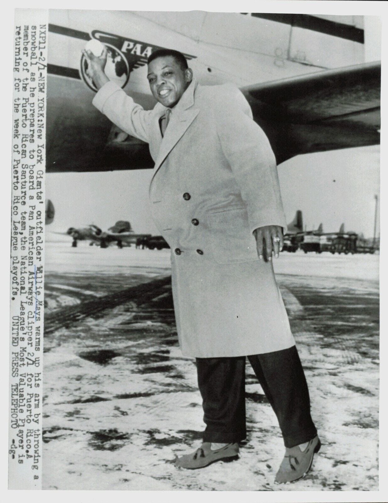 Willie Mays soft tossing before flying south to Puerto Rico in 1955