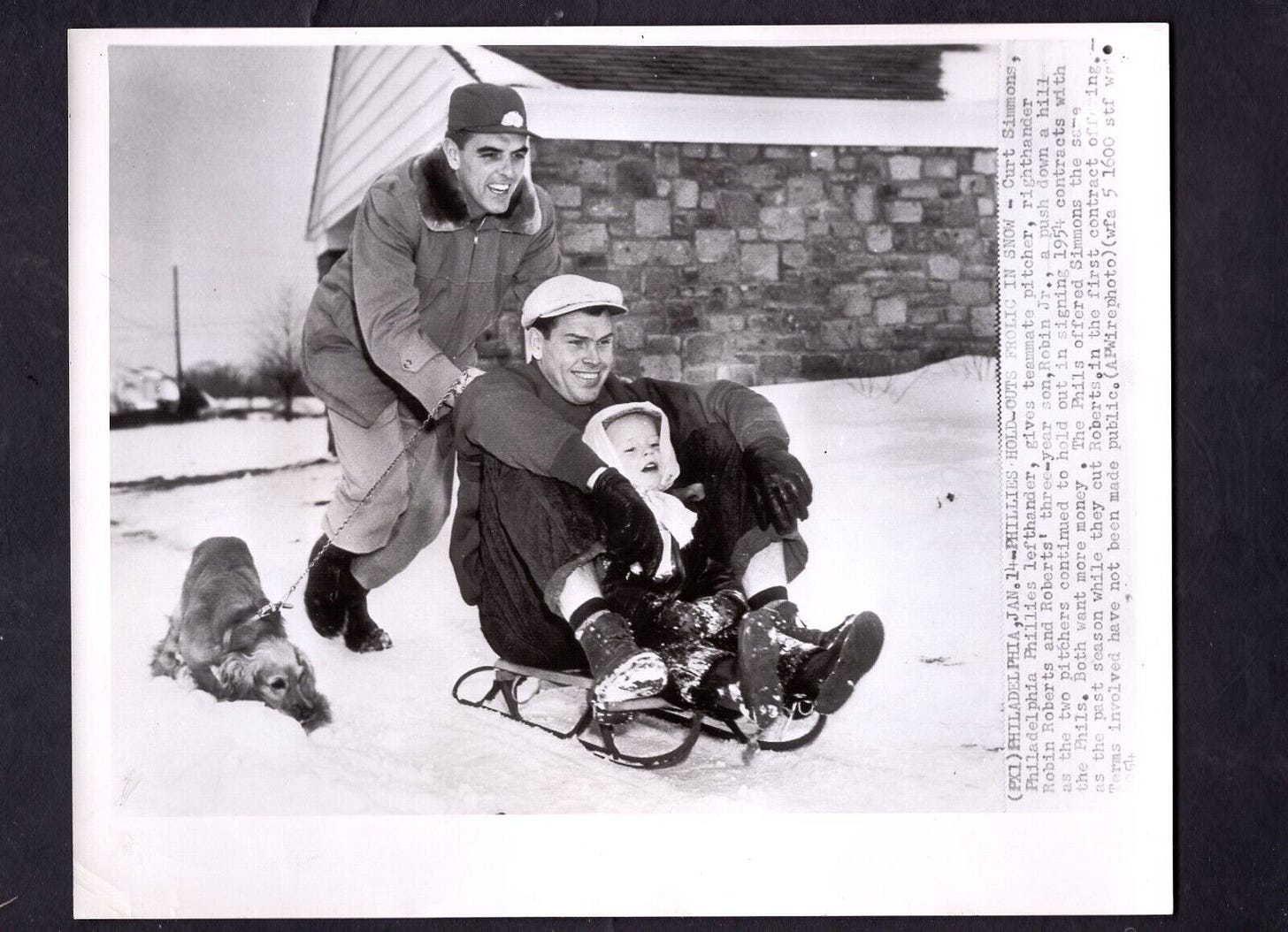 Curt Simmons helps out teammate Robin Roberts as the Philadelphia Iditarod gets underway.